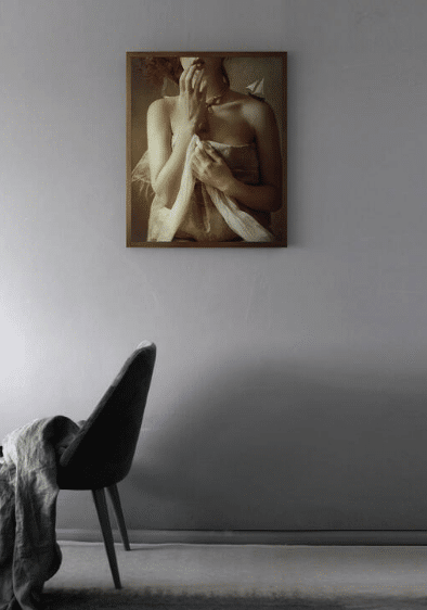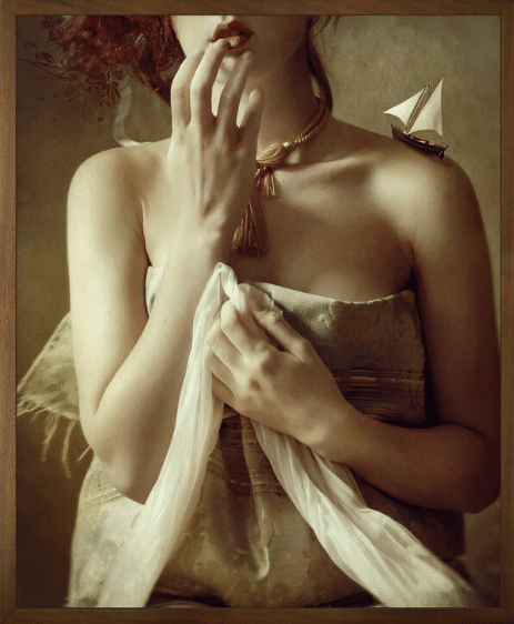 Solitude wall art is a popular theme and is part of the subject matter to be found in ‘A loner who hates to be alone’. A contemplative young woman is seen, seemingly deep in thought. She covers herself in a decorative fabric, and a solitary lonely ship sits on her shoulder.