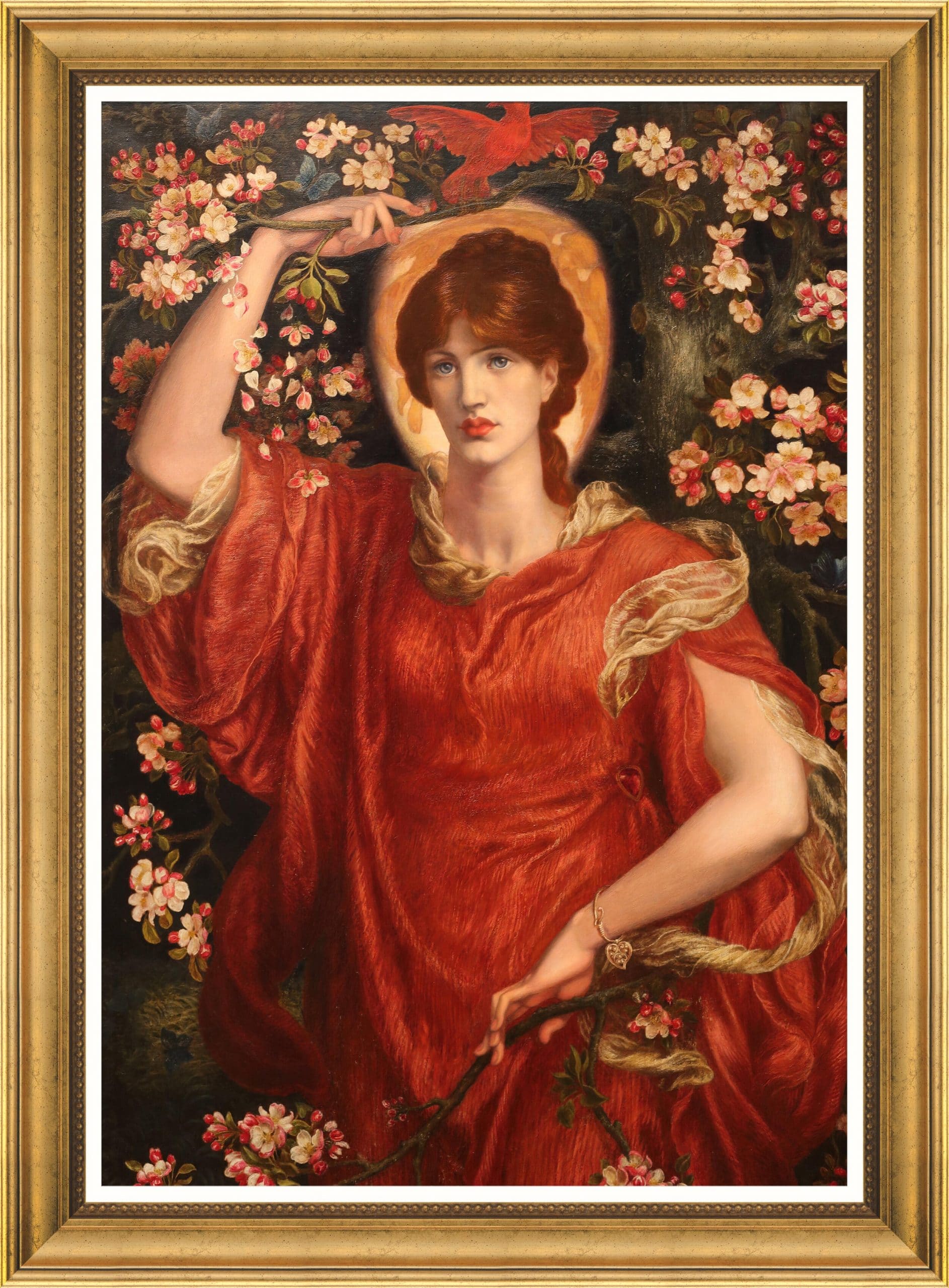Another romantic style portrait signed by English artist Dante Rossetti. A Vision of Fiammetta is an oil painting in the Pre-Raphaelite style. The subject of the painting is Boccacio’s muse named Fiammetta. Framed with antique gold frame and white slip.