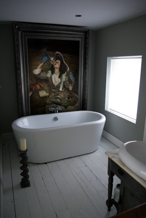 ‘Air’ is part of the Renaissance Collection and features an extra large ornate frame printed onto canvas. This beautiful print, reminiscent of classic Dutch Old Master paintings, is of a woman drinking from a large glass of the purest swirling air.