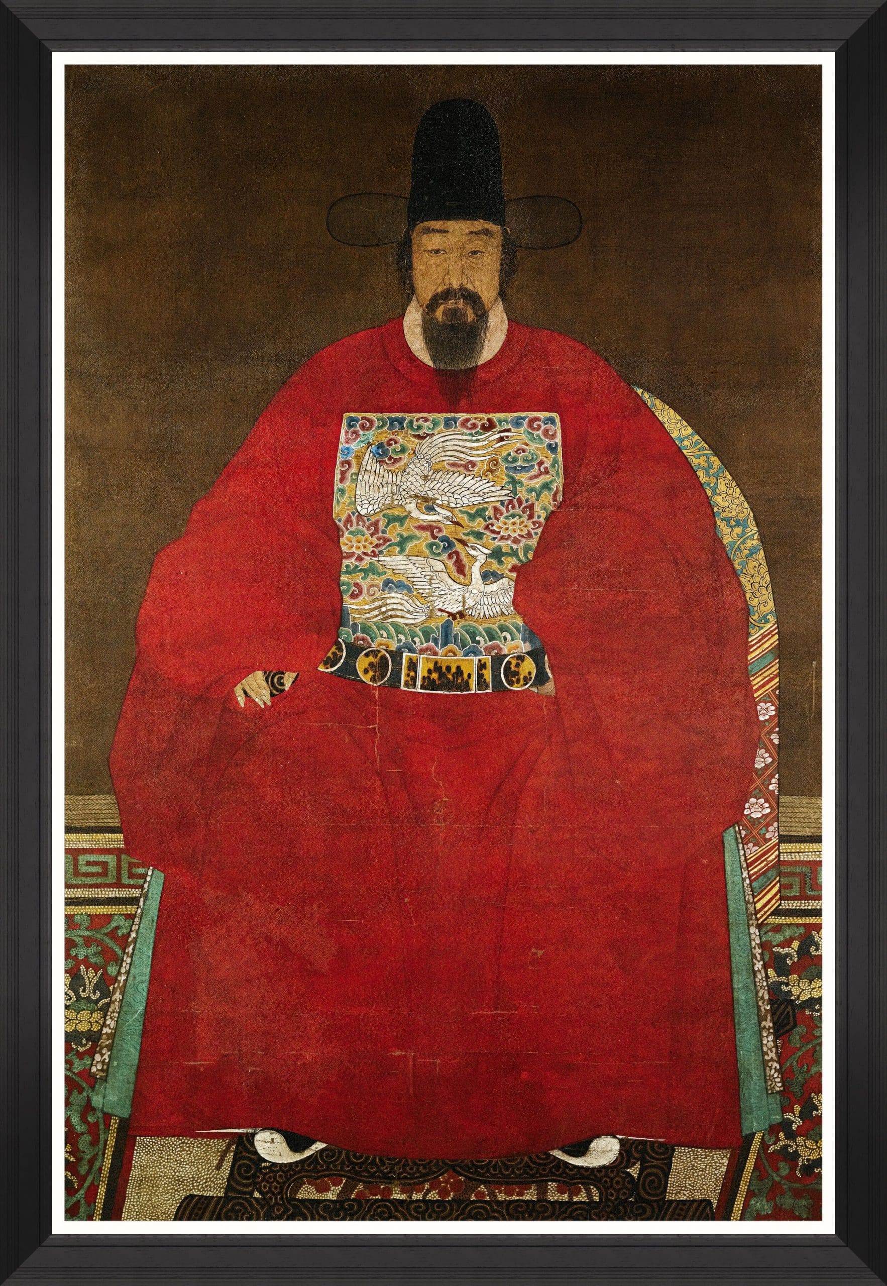 A chinese artwork made of ink and colour on silk, depicting a bearded official with serene expression, adorned with a winged black hat and long flowing red robes. Dated to late Ming dynasty, the reproduction is framed with Lincoln black frame and white slip.