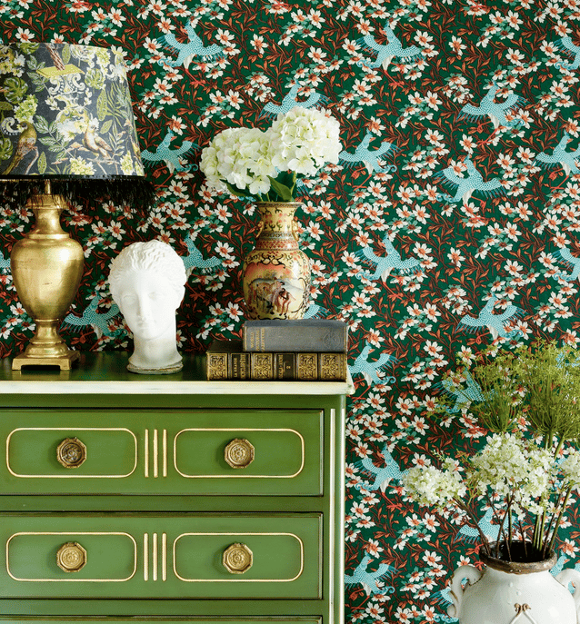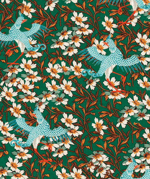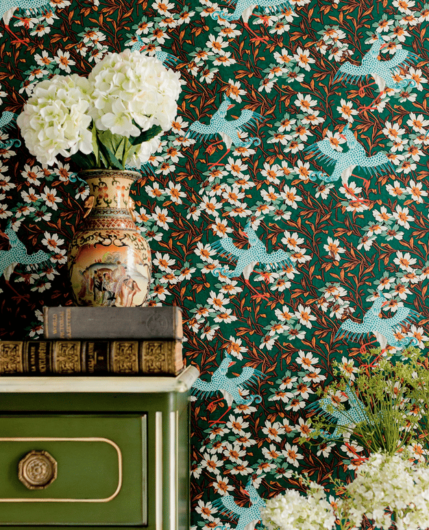 Blending Chinese symbols and motifs, the CHINOISE Wallpaper brings to life a fascinating, exquisite design. The very detailed pattern brings a white touch of efflorescence, while the bluebirds and green background set a soothing, natural garden mood. Enthralling and enchanting, this design invites spring in, as it blooms with candour.