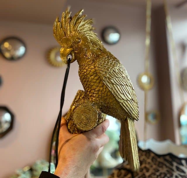 Light up your room with this exotic antique gold wall lamp. This chirpy Cockatoo easily hangs from the wall and can be plugged into a 13 amp UK plug socket.
