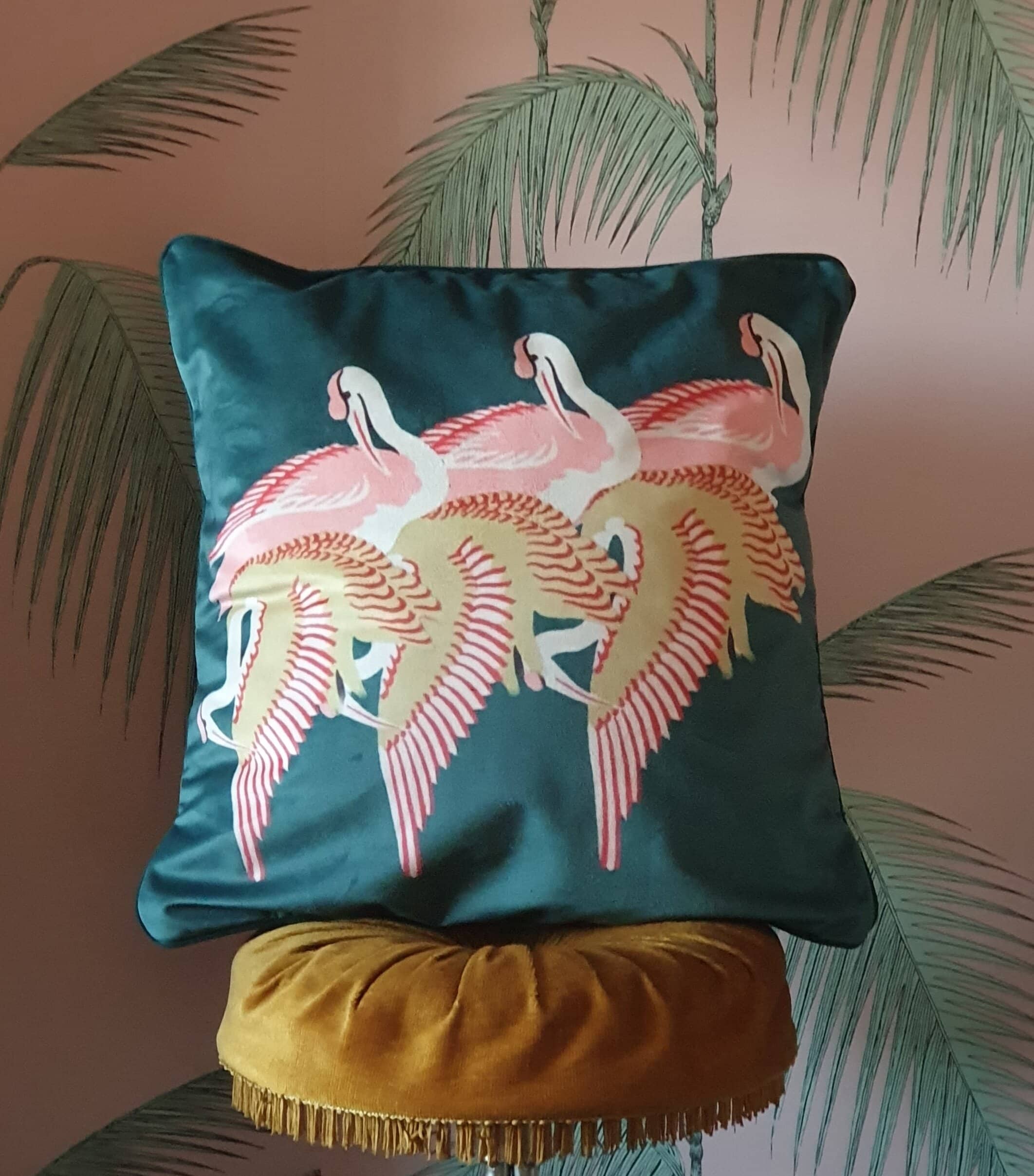 Deco Cranes cushion with green velvet piping. Black velvet at rear with vintage button.