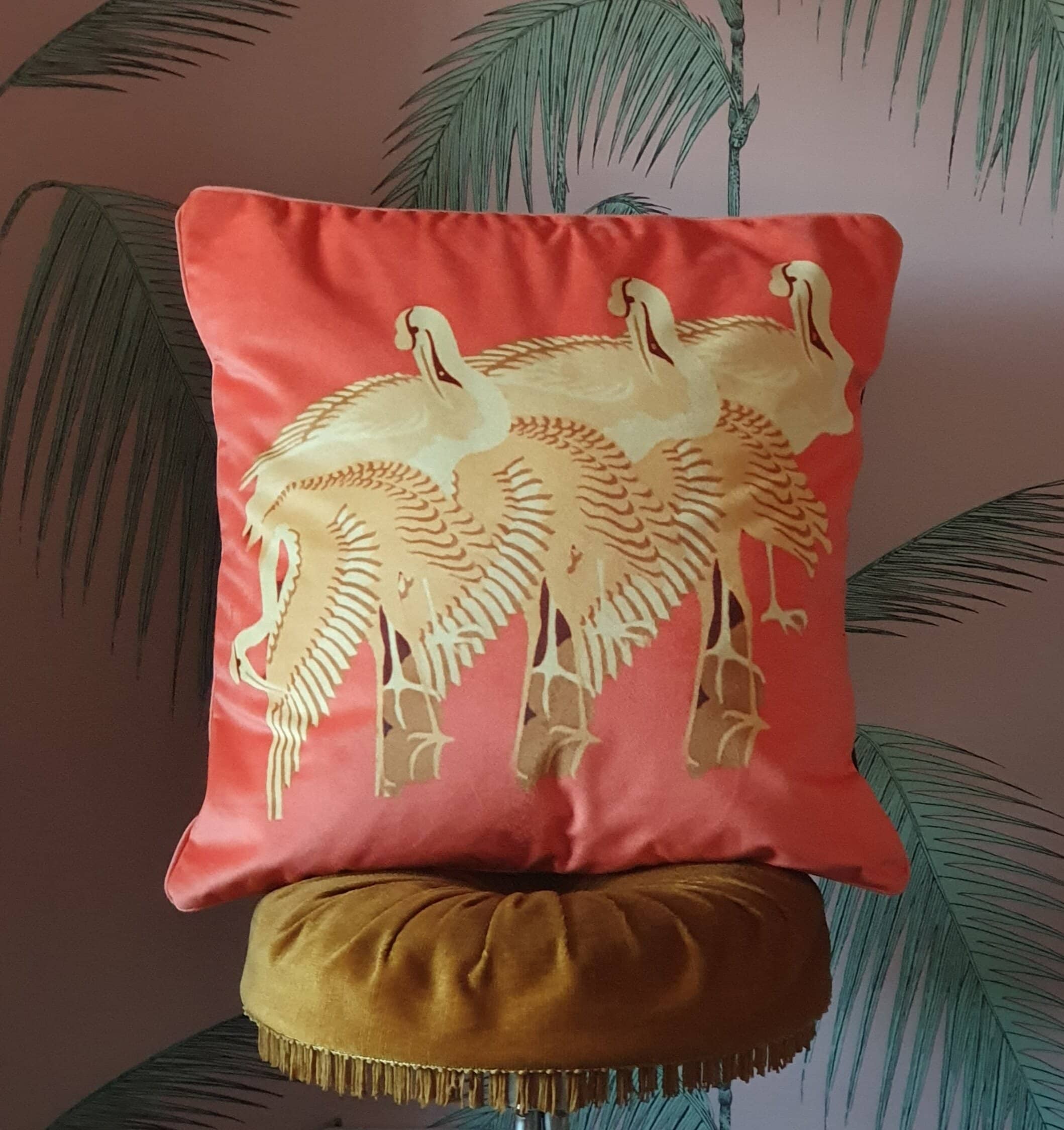 Deco Cranes cushion with gold print andcoral piping. Black velvet at rear with vintage button.