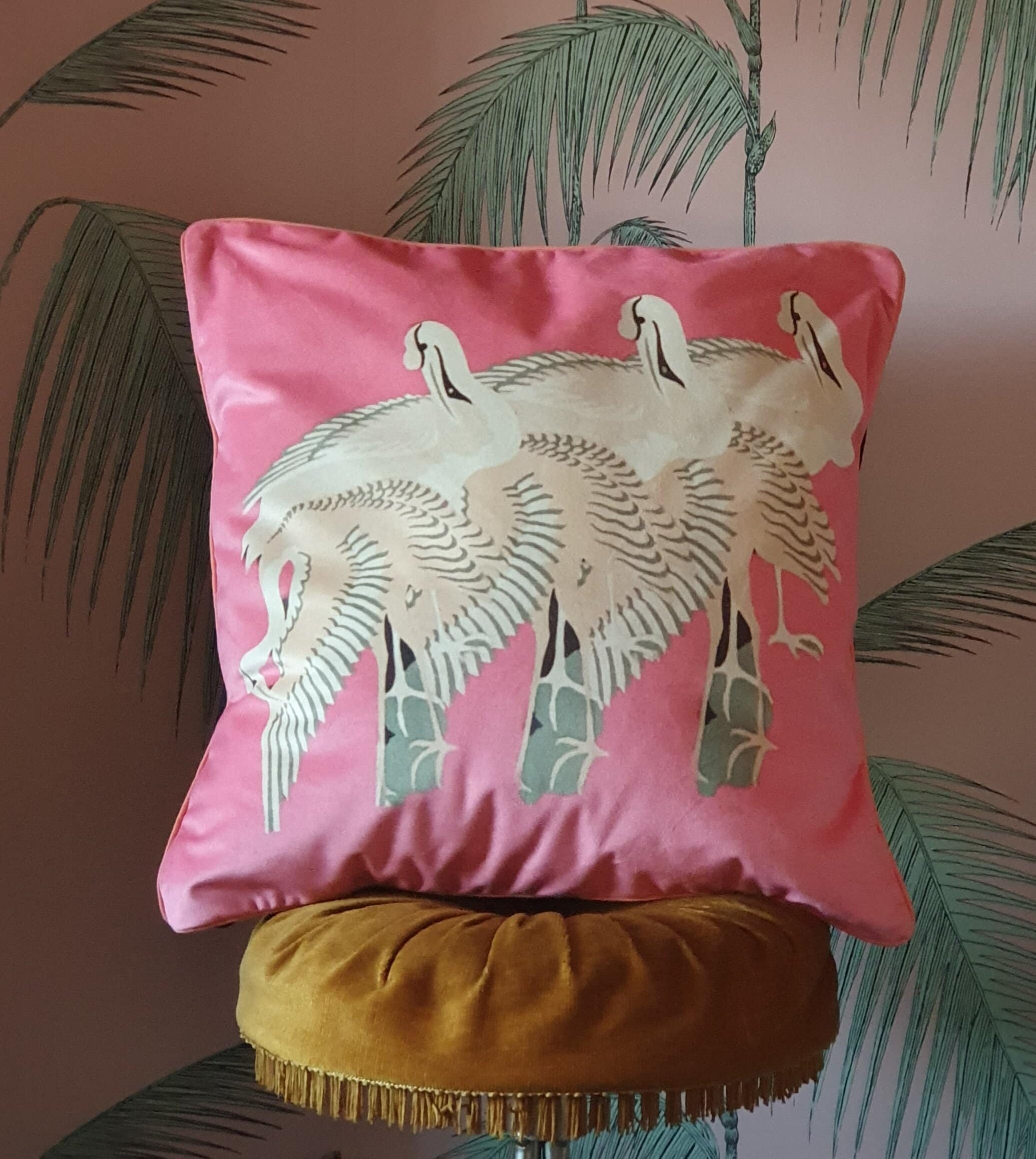 Deco Cranes cushion with coral piping. Black velvet at rear with vintage button.