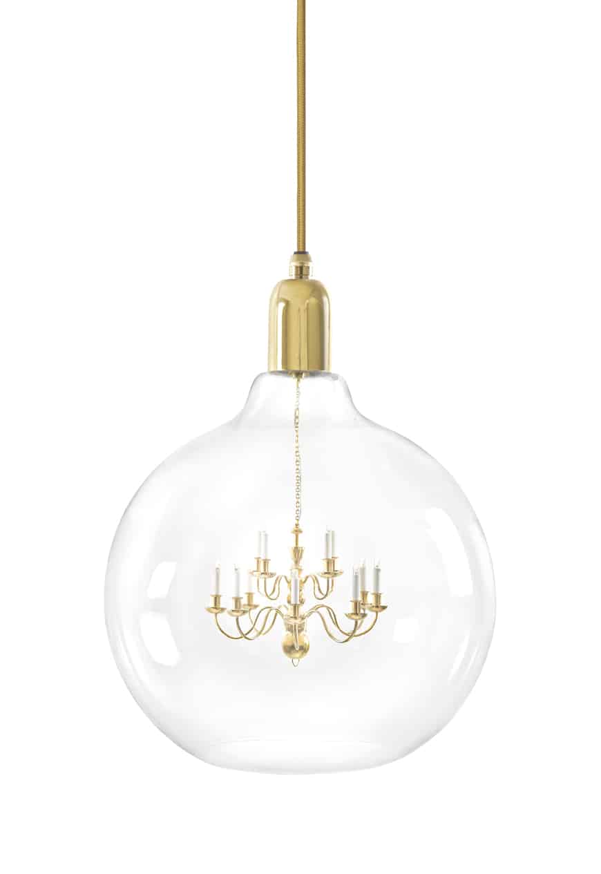 The ‘King Edison Grande’ pendant lamp combines the pure simplicity of an Edison light bulb with the romance and glamour of a King chandelier. It consists of a miniature brass chandelier inside a hand-blown clear glass shade. In the new larger size, the King Edison makes a real design statement and will make a stunning centrepiece over a table; hanging either side of a bed; or in a hallway.