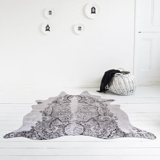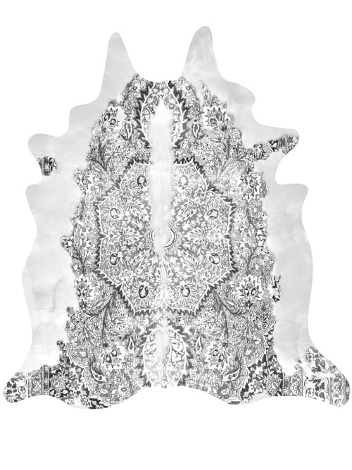 The Persian cowhide is unlike any cowhide you have ever seen. It’s from a very exotic breed of beast that lives in the fantasy world of designers Young & Battaglia. The piece is a playful and unexpected marriage between two of the most iconic rugs in the world. The meticulous and geometric Persian carpet is seamlessly combined with the natural irregularity of an animal skin rug. The design is made possible by digitally printing on to a special fabric backed rubber which is the hand cut in to its final hide shape. Unlike real cowhides, this one is hypoallergenic, washable, non-slip, and will not curl up at the edges. A fusion between art and utility, this rug will add a beautifully surreal touch to any interior. Material sample available on request.