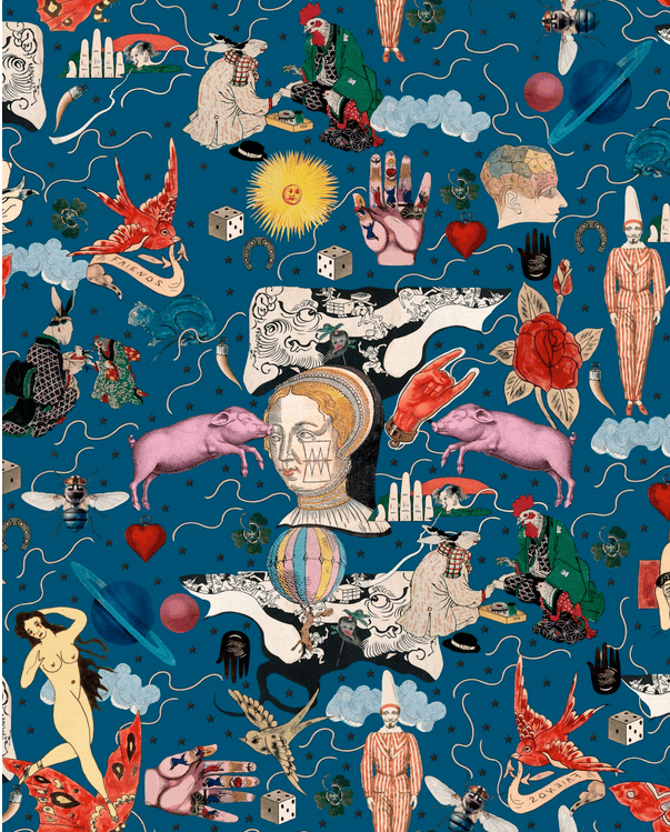 Absorb yourself in a world of magic, and optical illusions, where the boundaries of reality become blurred. Let your imagination take you to another realm where pigs fly, animals play games and lucky charms are there for the taking. Above the stars, the clouds, and the solar system, lies this ILLUSIONARY DAYTIME. One where you can escape to, from reality as you know it. One where magic is actuality, broadening your horizon and letting your sense of wonder take over in this dreamlike sphere set against blue and green backgrounds.