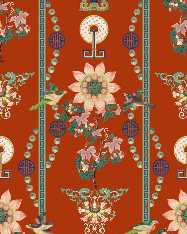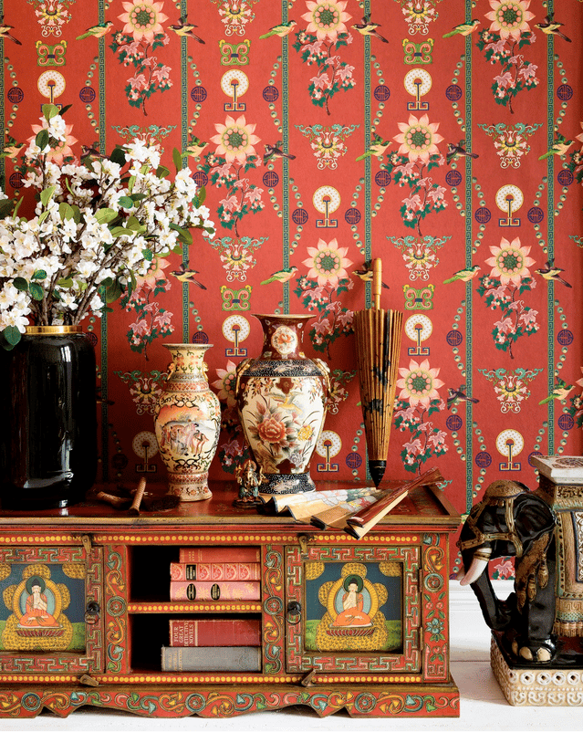 Revive any space with this beaming floweret wallpaper design. Inspired by one of the famous Chinese gardens, LIN YUAN wallpaper elegantly displays auspicious plants, birds and plum blossoms in a gracious entwine. Authentic Oriental motifs and symbols of luck, wealth and immortality, peak behind the gates of heavenly pattern, creating a lavish, bountiful atmosphere. Also available against a red background. and captivating domain.