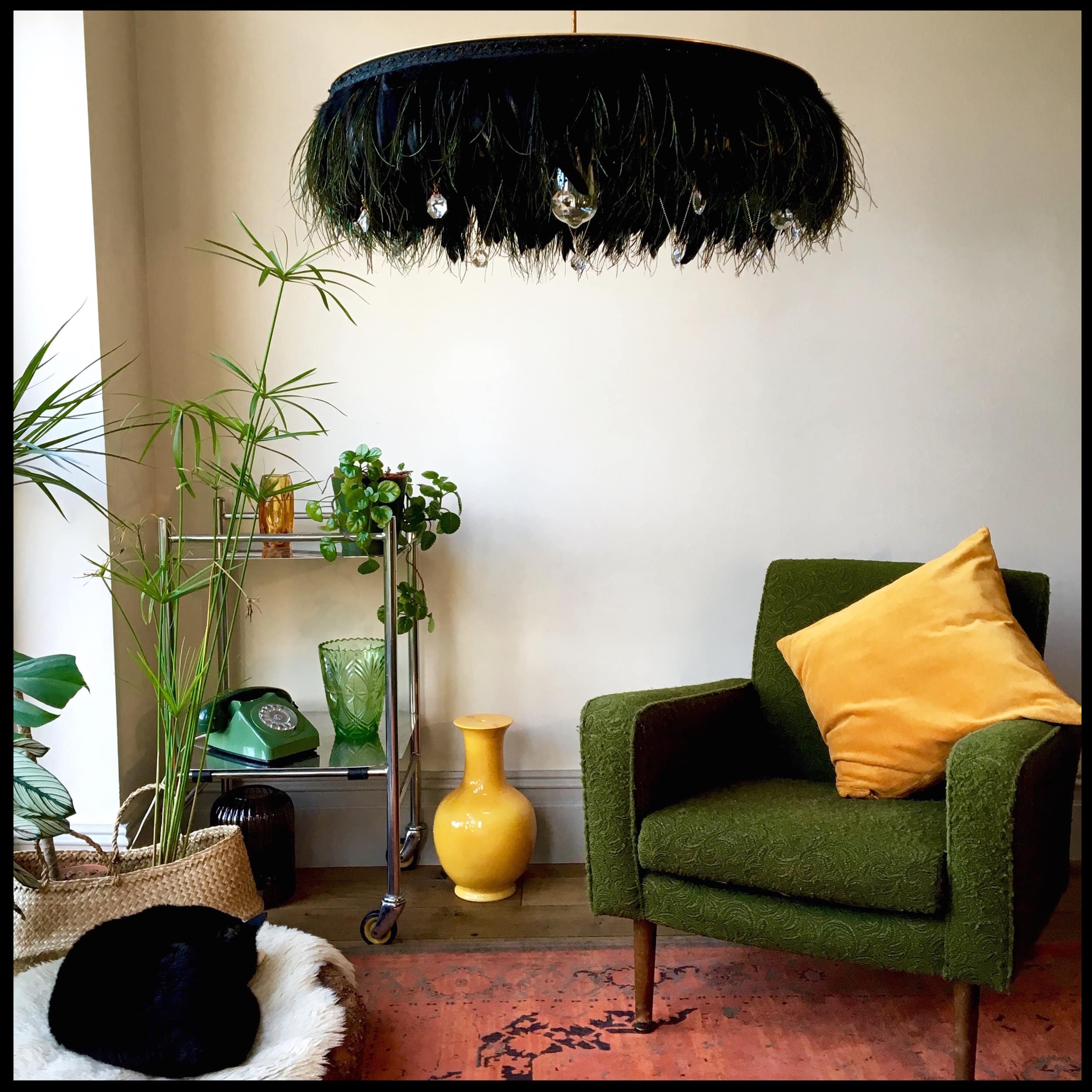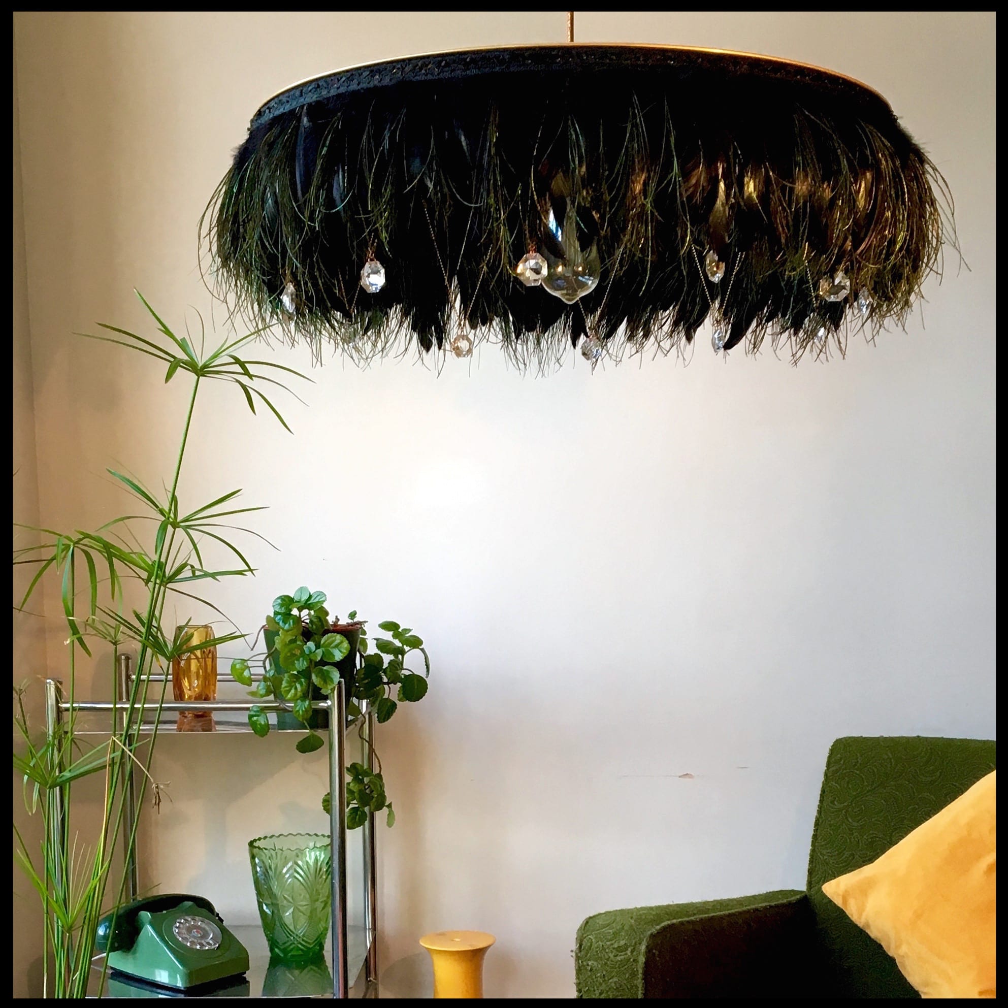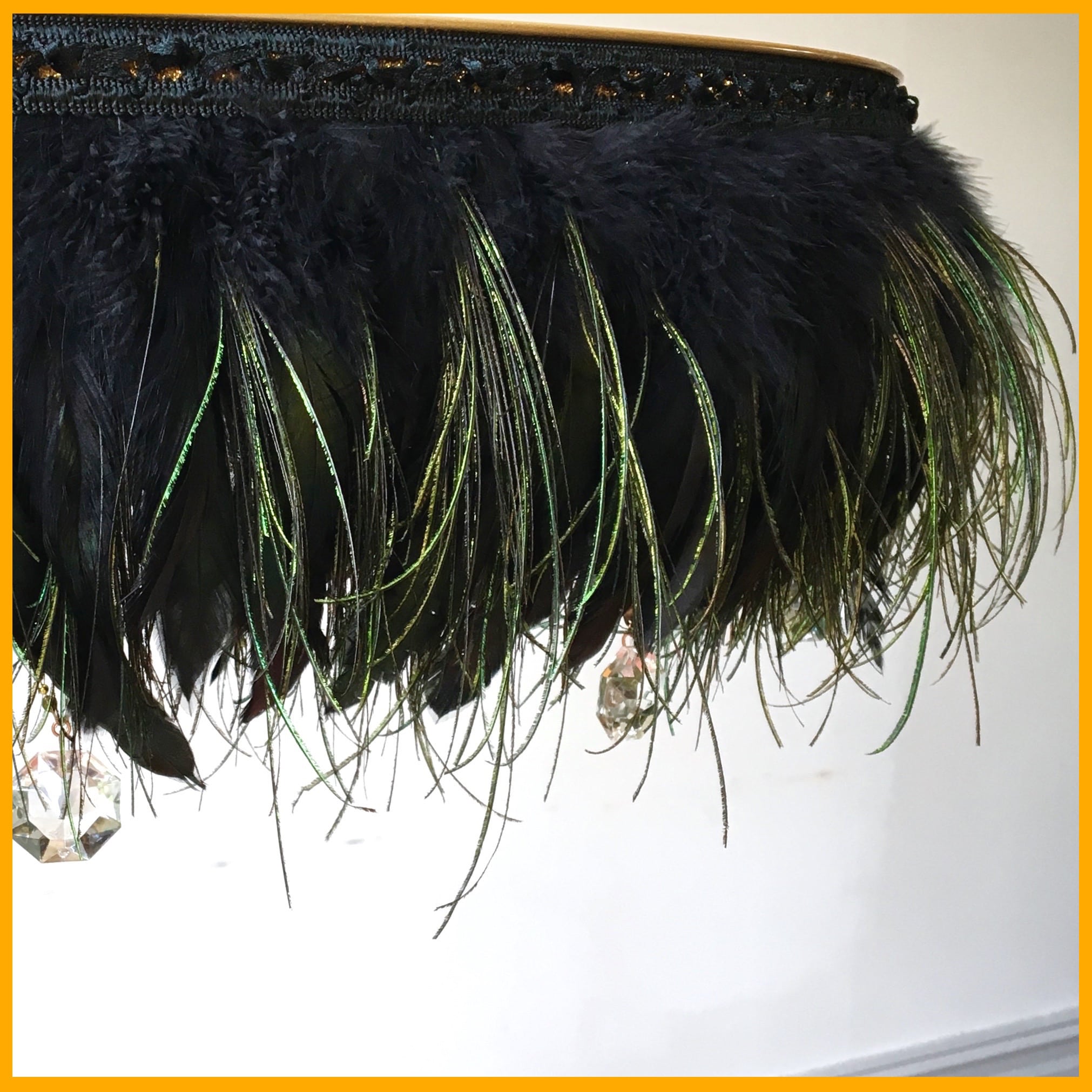 Sleek and textured, soft and strong; a dark, sumptuous chandelier. This is a feather-light made for touching. The black rooster feathers are soft and supple and respond beautifully to breeze. The inner layer of iridescent peacock feather herl can be teased out for a shaggy textured look or smoothed down as a secret metallic inner layer. Gold ball chain and lead crystal complete an opulent, decadent look.
