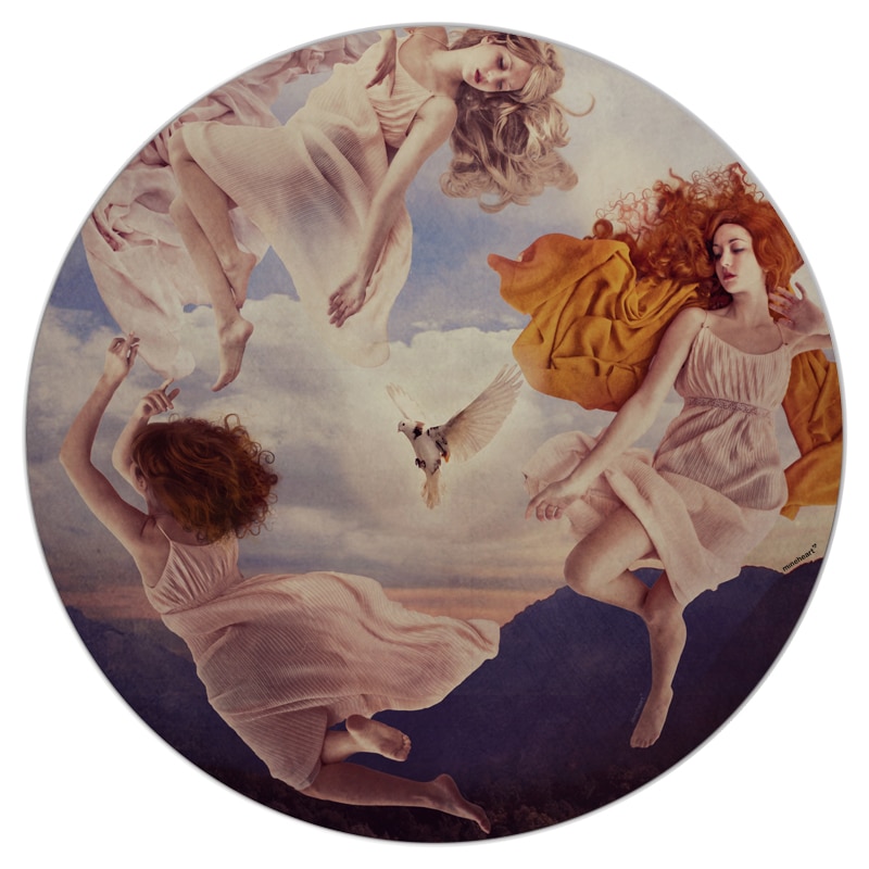 The ‘Sistine’ pendant light is inspired frescos and chapel ceilings. An elegantly proportioned circular shade supports a diffuser featuring an image of 3 sisters floating in the sky around a dove. The halo of light around the dove is positioned directly below the light source so that when the light is on, the light emanates from the dove. The minimalist slim shape combined with the dreamlike imagery can add a touch of romance to both modern and traditional interiors alike. Designed by Young & Battaglia with artwork by Himitsuhana.