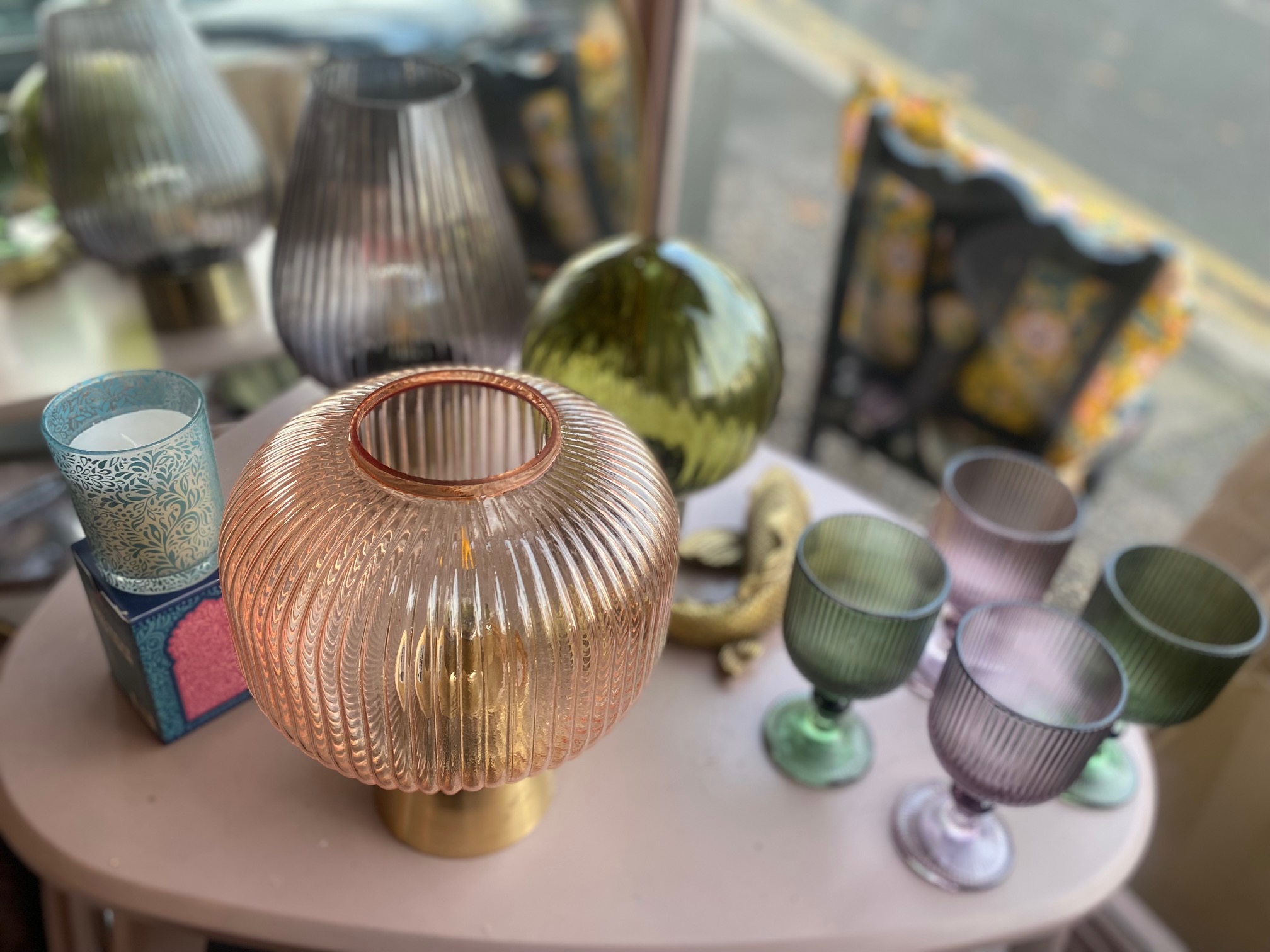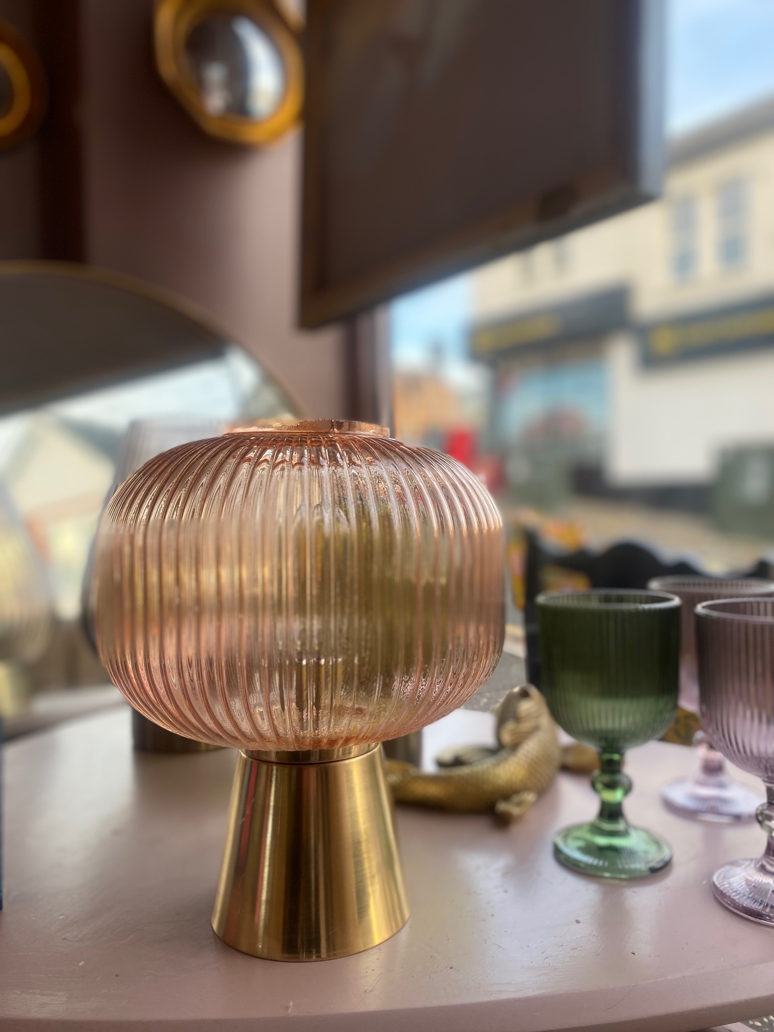 This 27cms LED glass round ridge lamp in soft pink, casts a warm inviting glow, ideal for enhancing the ambience of any interior.