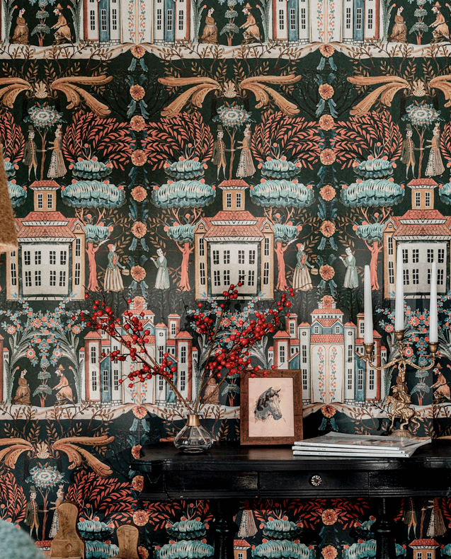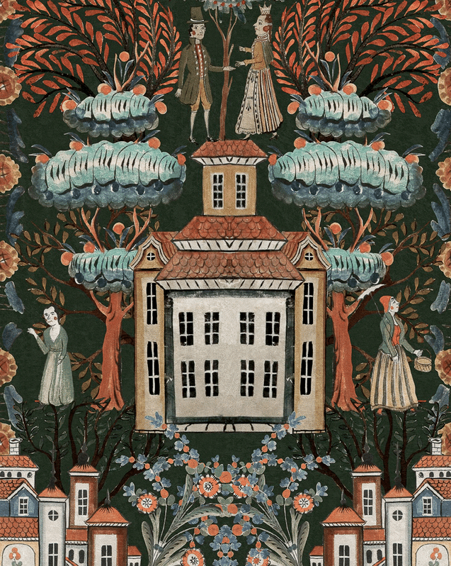 Step into a world of wonder with TALES OF TYROL, a magical design where Tyrolean architecture and village folk come together under a canopy of fantastical foliage. Rosy cheeked in their traditional costumes, these charming characters inhabit an imaginary town surrounded by trees and flowers in a host of jewel-like shades.