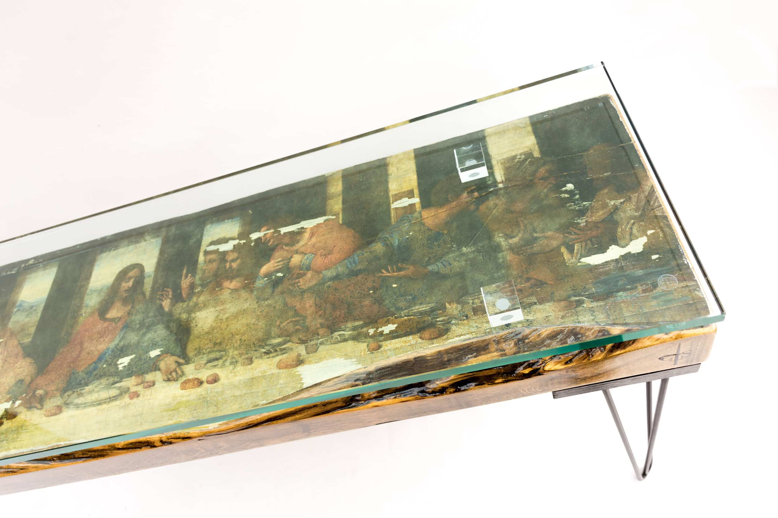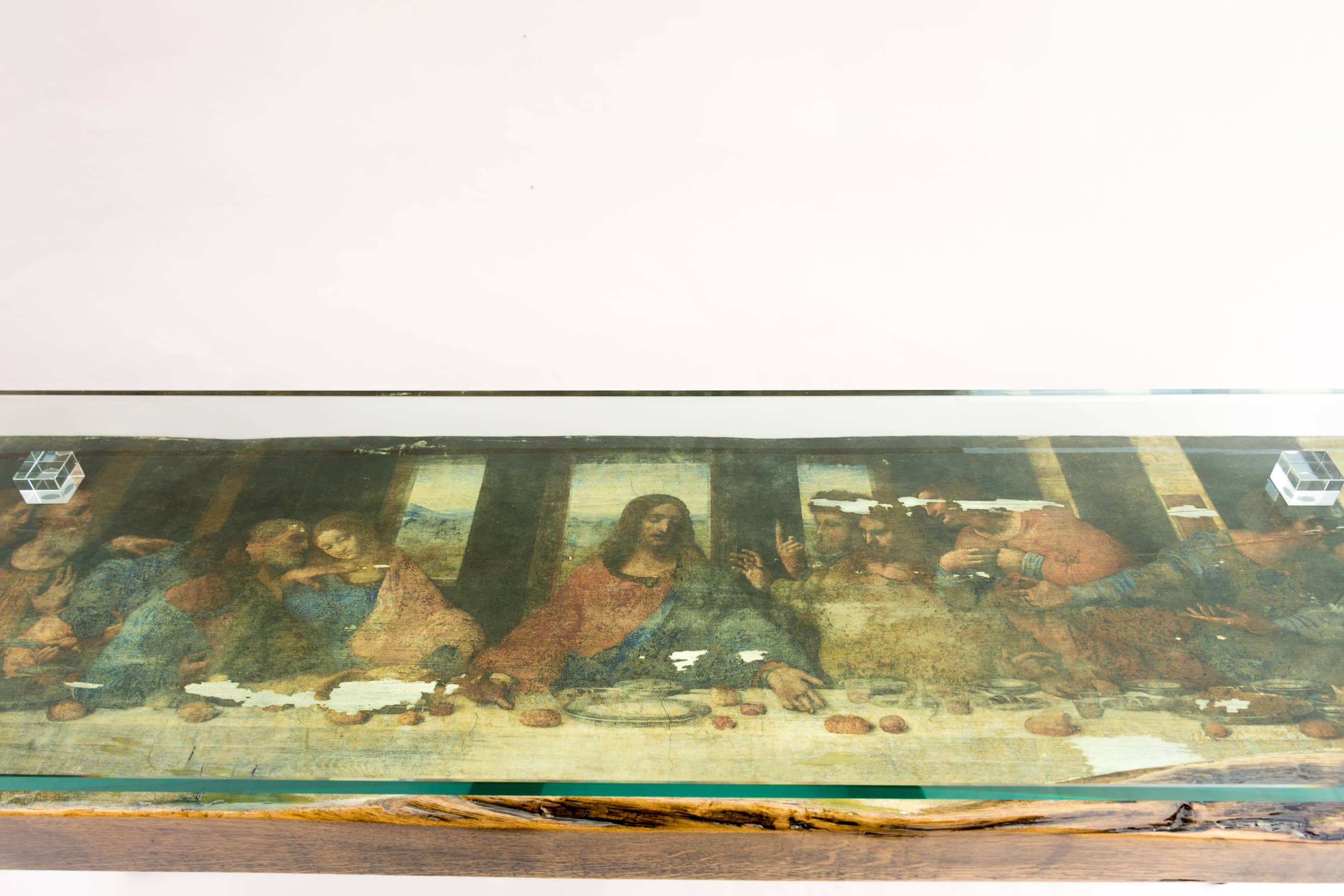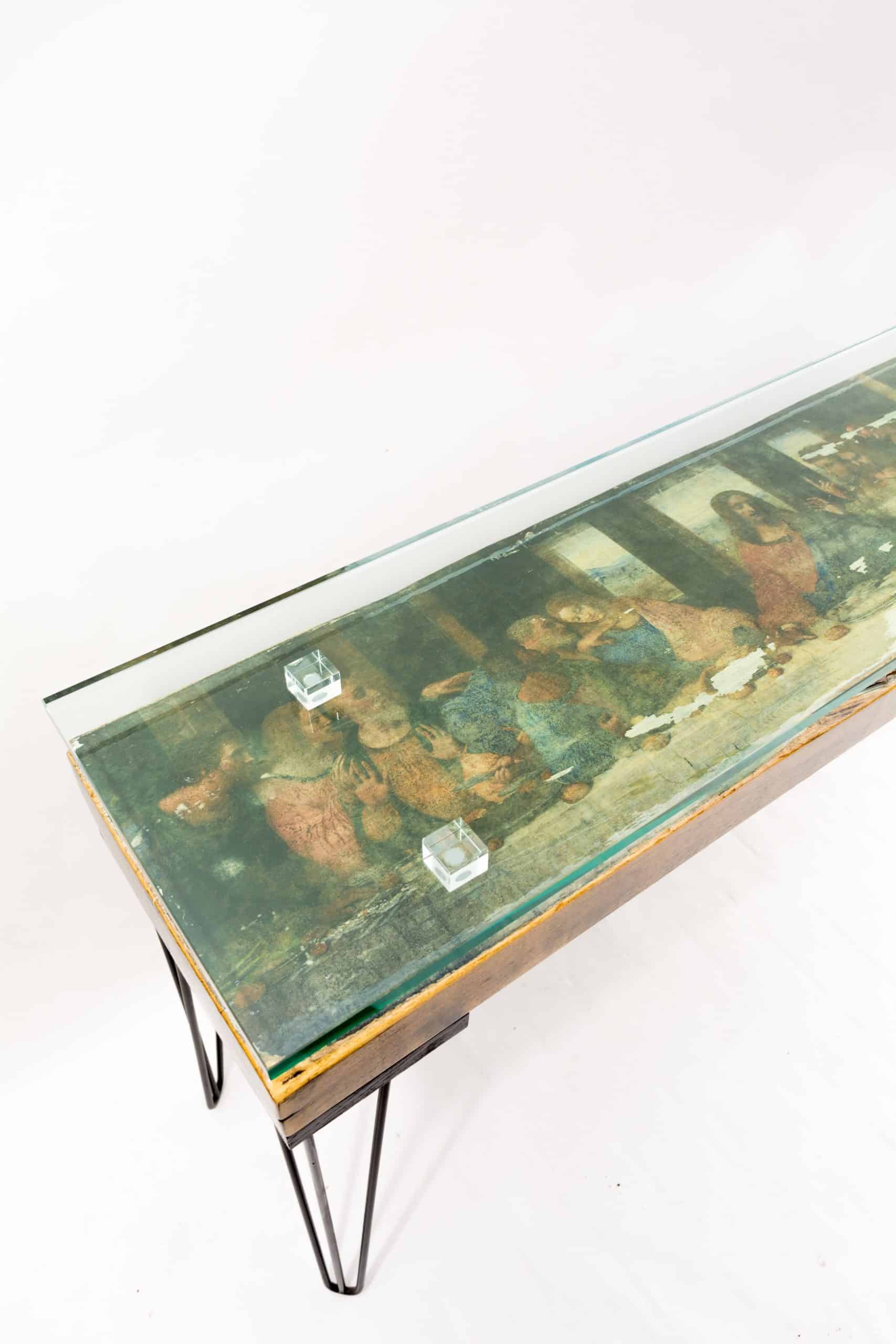 Hand made in England. A stunning “The Last Supper” imaged console table, made from reclaimed distressed wood, black oak newels squares and stylish black hairpin legs, glass block supports, supporting a 20 mm thick glass top. Finished off in a high gloss varnish.