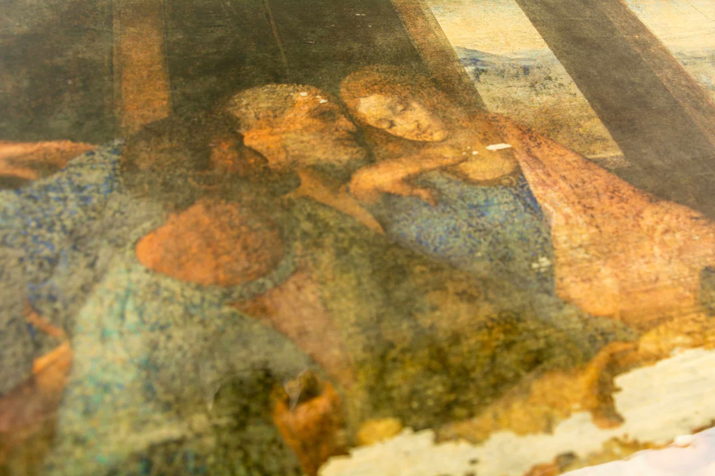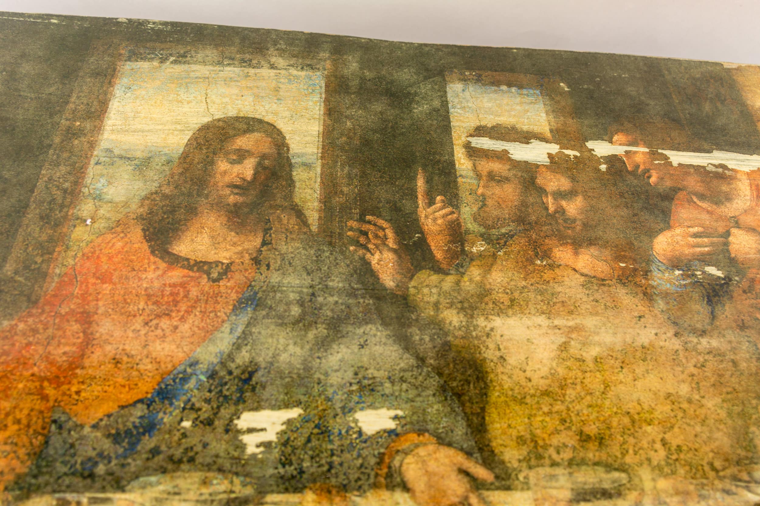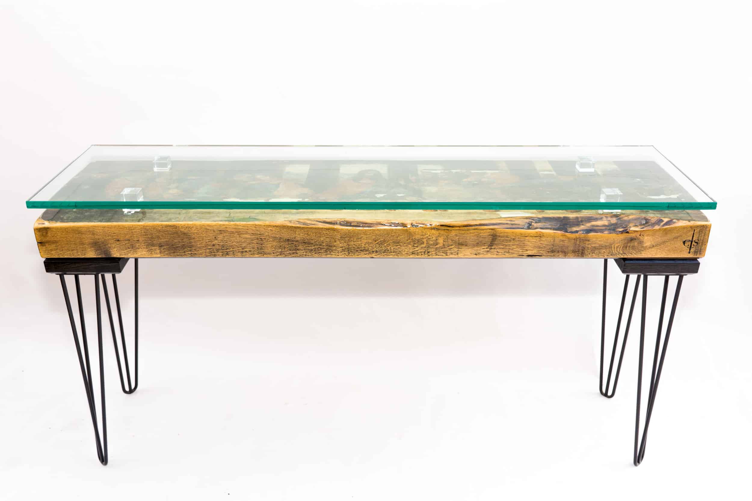 Hand made in England. A stunning “The Last Supper” imaged console table, made from reclaimed distressed wood, black oak newels squares and stylish black hairpin legs, glass block supports, supporting a 20 mm thick glass top. Finished off in a high gloss varnish.