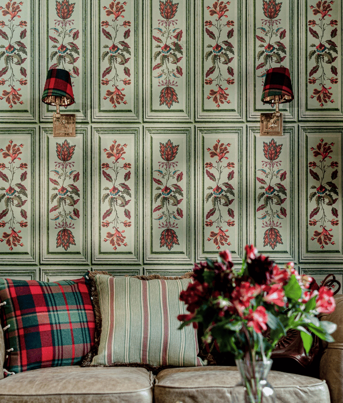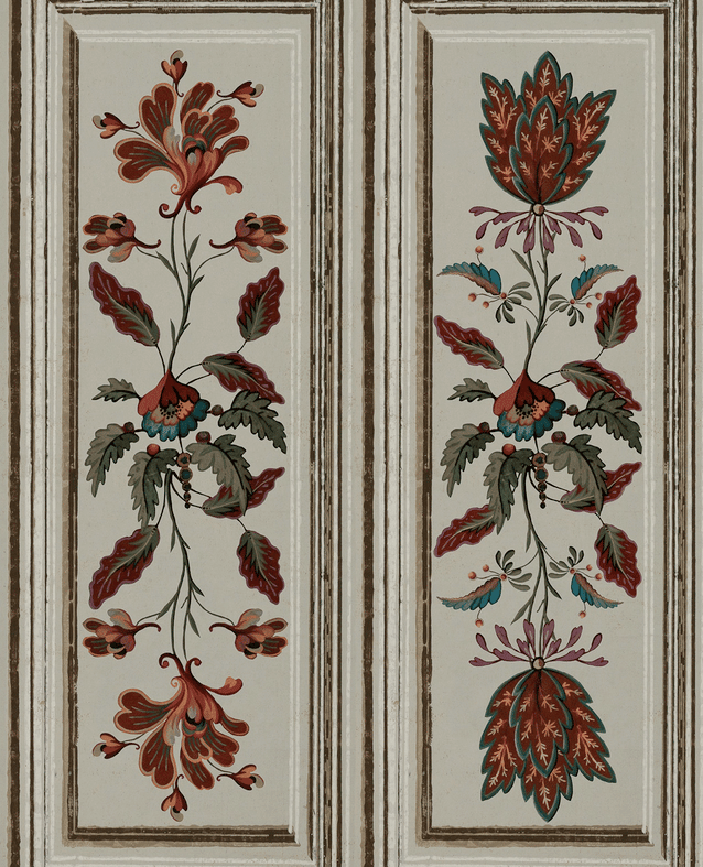 With its painterly strokes and folkloric inspired elements, this trompe l’oeil paper is designed to create the look of traditional Tyrolean panels to be found painted on furniture or even on the house walls. Available in taupe, alpen green and dramatic black, the fiery, stylised blooms and delicate leaves are framed by a convincing panel-like border creating a beautiful whimsy wallpaper.